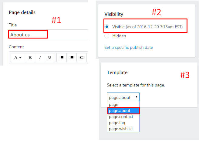 - In a Online Store / Pages, find and click button "Add a page"