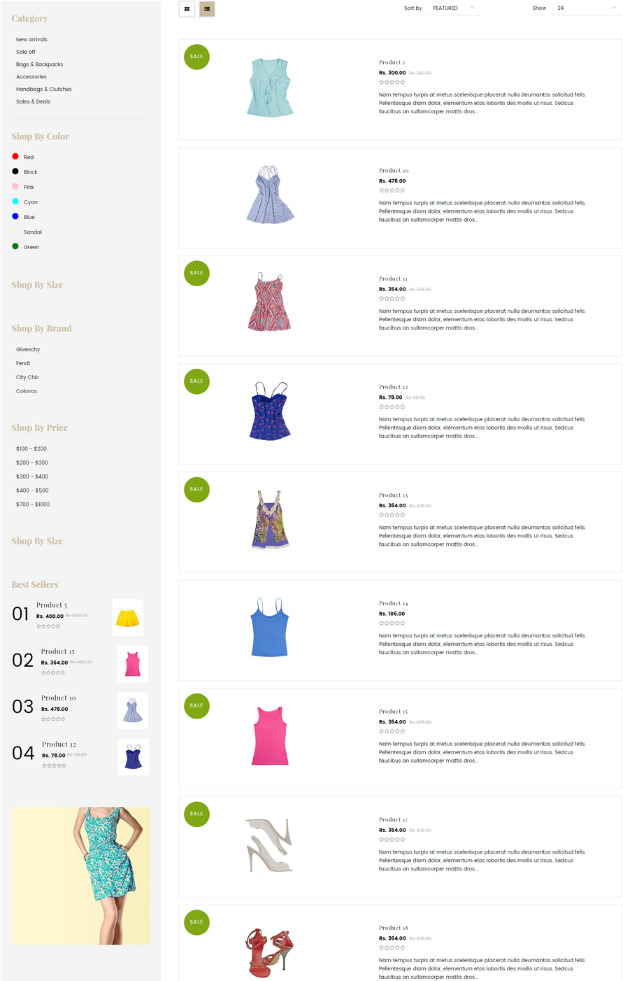 - Filters:Filters will work based on options [color, size, brands] that we configured in the respective section.