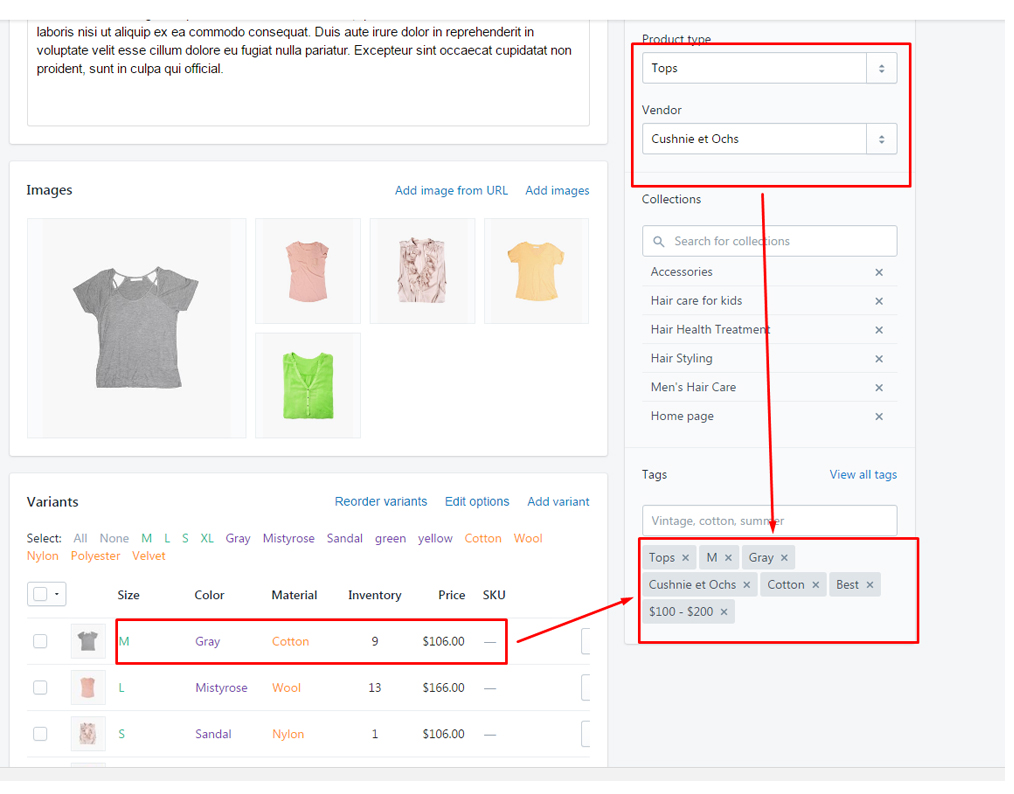 - You should add tags for each product as per variants (Color, Size) in your product tags fields.