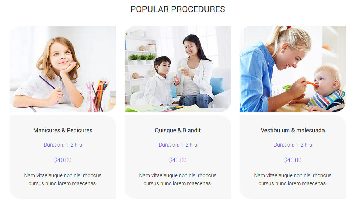[dt_sc_popular_content title="Manicures & Pedicures" image="7094" duration="Duration: 1-2 hrs" price="$40.00"]
