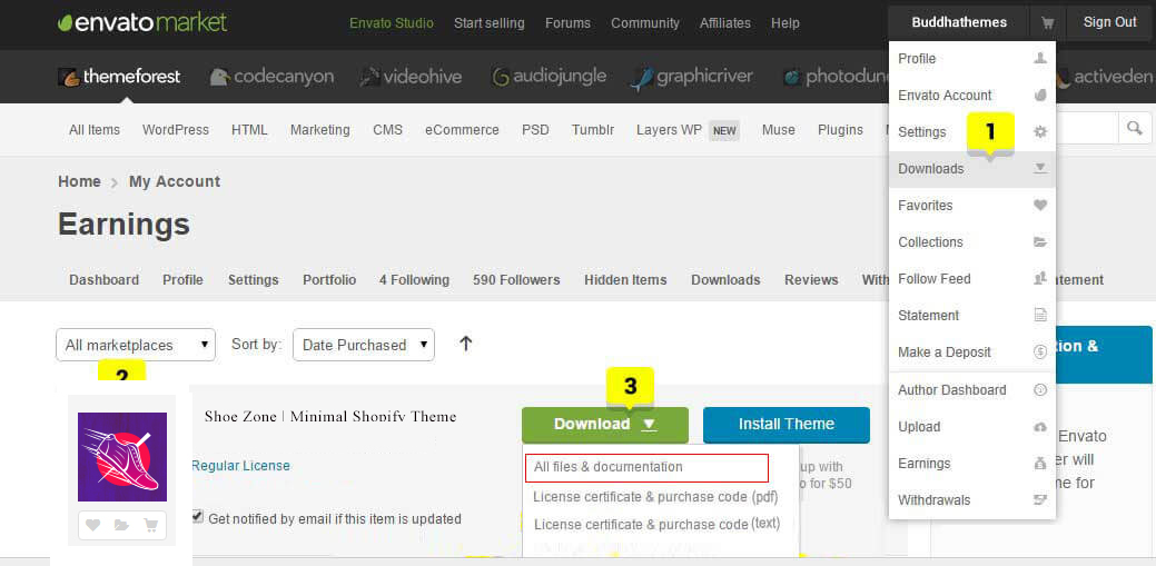 Step 1 : At first, after purchasing this theme, please download the package from Themeforest. All you need to do is move your mouse over your login name in right top corner (of course after you`re logged in Themeforest) and then click Download. Here you will find all the items that you have purchased.