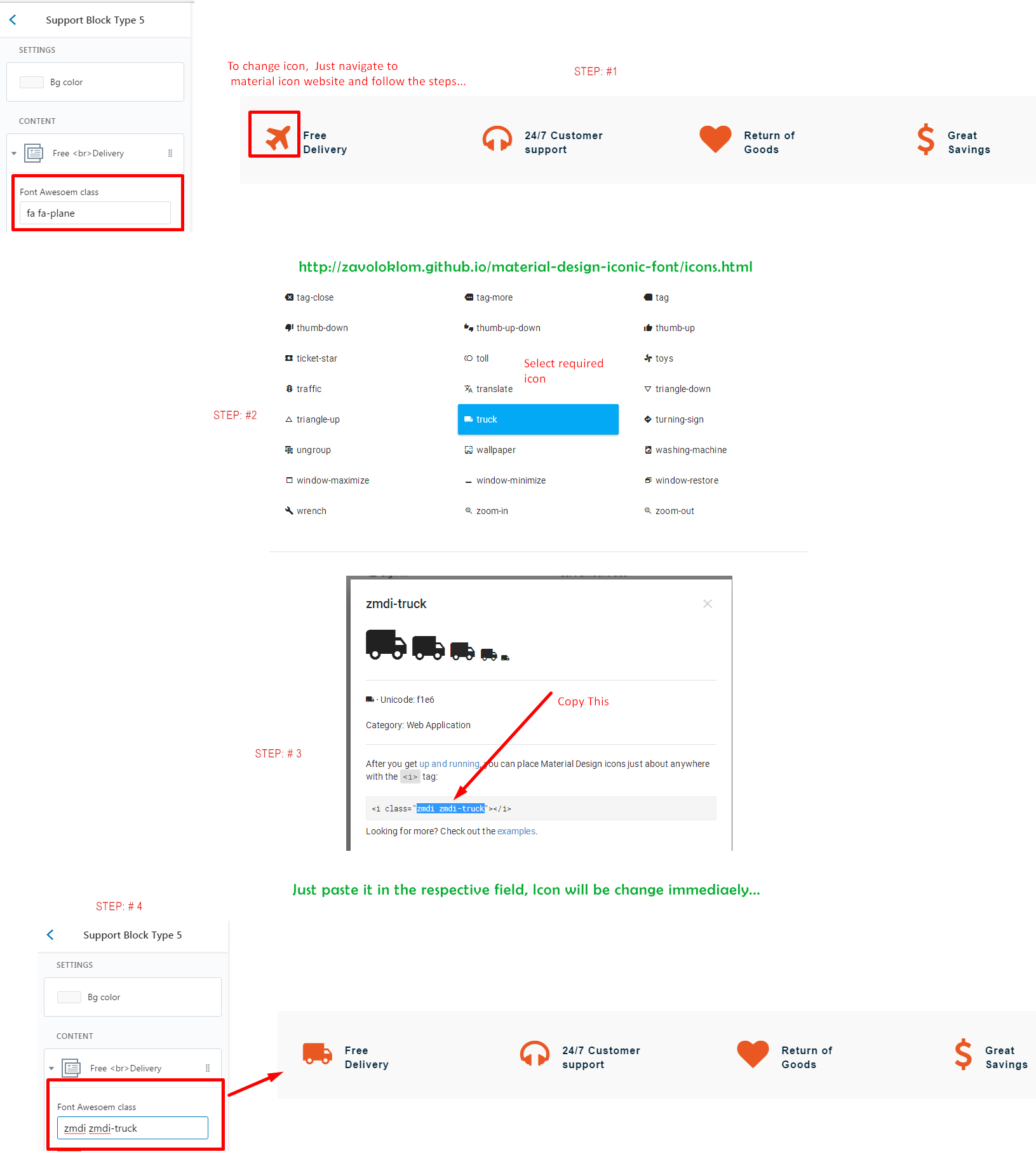 Add Material Design icon class in the respective field, E.g follow the screen shots...